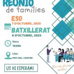 Reunió famílies ESO i BAT 2025/26 29/09/2025 - Reunió de famílies curs escolar 2025/26. ESO dia 7 d'octubre, Batxillerat 8 d'octubre a les 19 hores en el pati del centre.